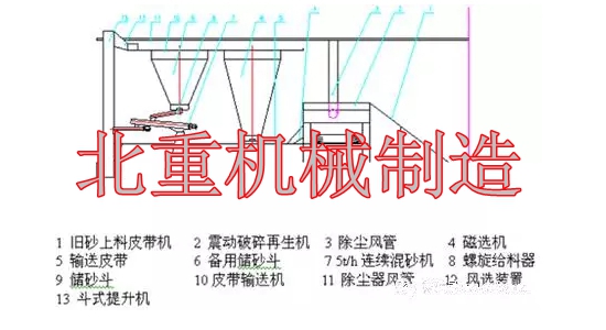 人工落砂后,舊砂通過上料皮帶機進入振動落砂機完成落砂、破碎、篩分,再生,經過帶由磁選的輸送皮帶進入斗式提升機,在輸送過程中人工加入新砂。在斗提的出口處安裝風選裝置,經過風選的型砂經皮帶輸送機進入儲砂斗。劃線平臺鑄件生產時,型砂從砂斗經螺旋給料器進入混砂機。